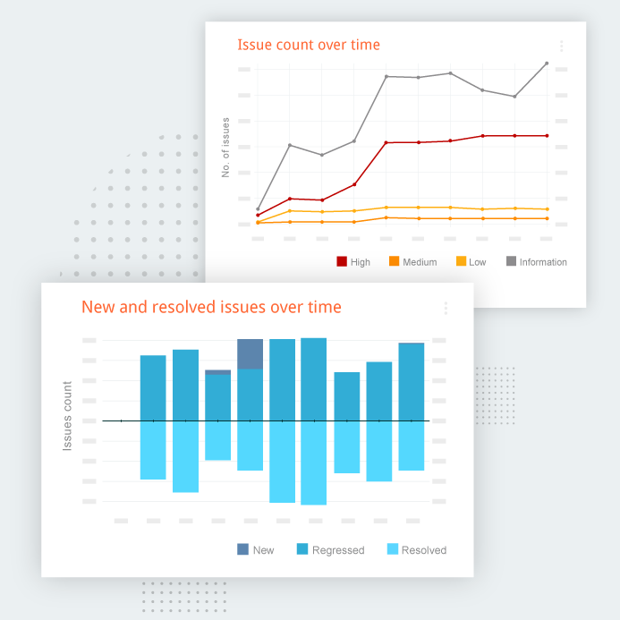 Los paneles intuitivos ayudan a identificar tendencias a lo largo del tiempo. Reciba informes de escaneo por correo electrónico, expórtelos a otras herramientas y genere informes para estándares de cumplimiento específicos.