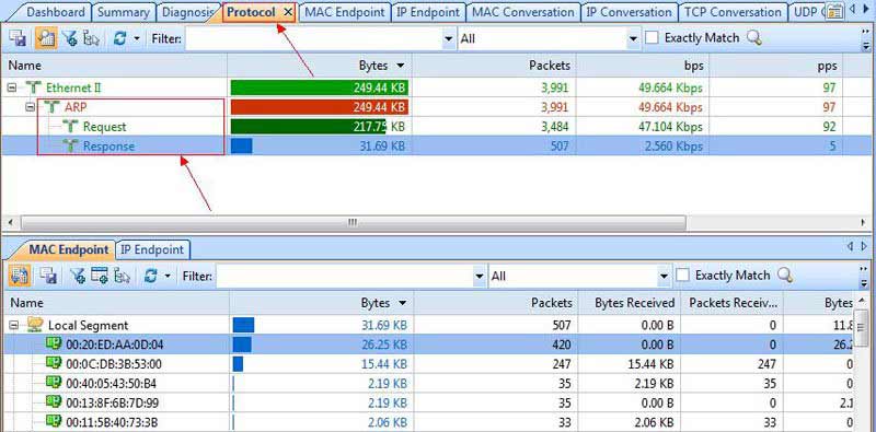 Podemos ampliar nuestra investigación con el uso de la pestaña Protocolo, que nos permite profundizar en el protocolo ARP y ver qué direcciones MAC de los hosts están involucradas en el tráfico pesado del protocolo ARP: