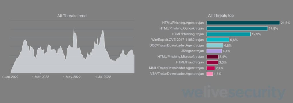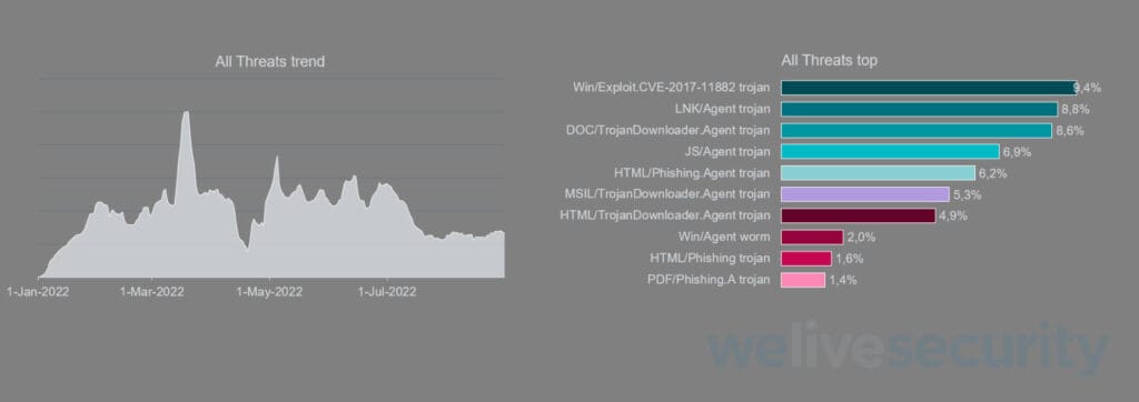 Los últimos cuatro meses de 2022 fueron el tiempo de las vacaciones de verano para muchos de los que están en el hemisferio norte, y parece que algunos operadores de malware también aprovecharon este tiempo para descansar, reenfocarse y volver a analizar sus procedimientos y actividades actuales. A nivel global, luego de unos picos en mayo y julio, las detecciones de amenazas informáticas en general disminuyeron levemente. En América Latina, el comportamiento fue similar.