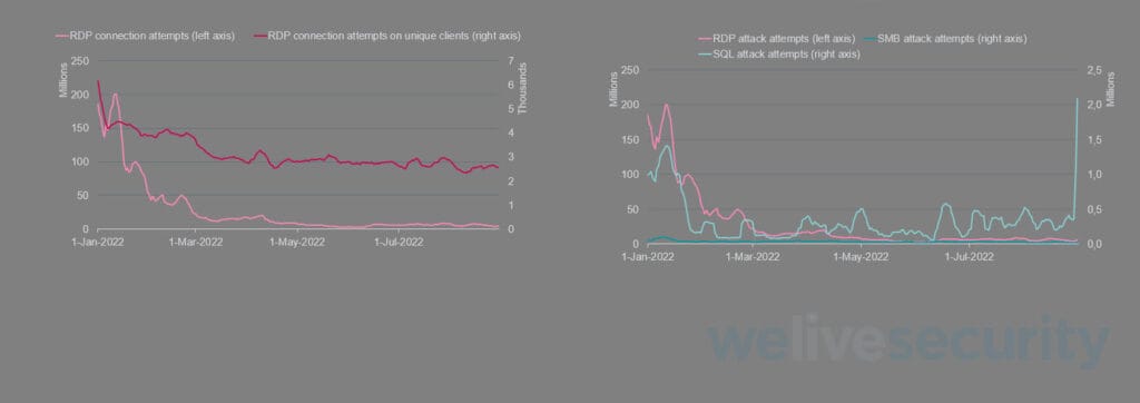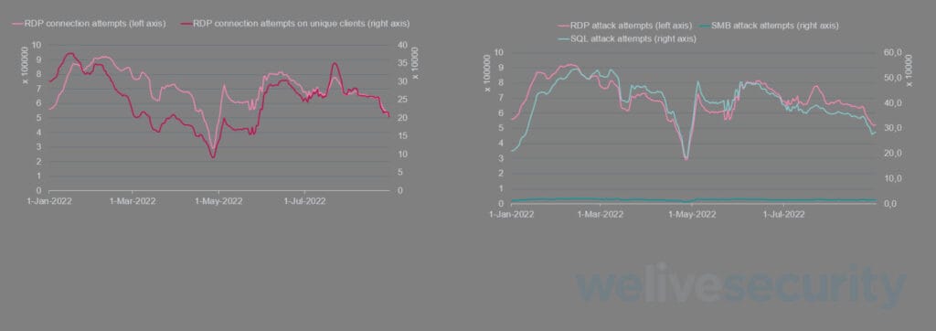 Sin embargo, en América Latina el comportamiento fue diferente, ya que si bien fueron más estables a lo largo de lo que va de 2022, después de mayo se registró un aumento en la cantidad de intentos de ataque al RDP que se mantuvo estable hasta fines de agosto.