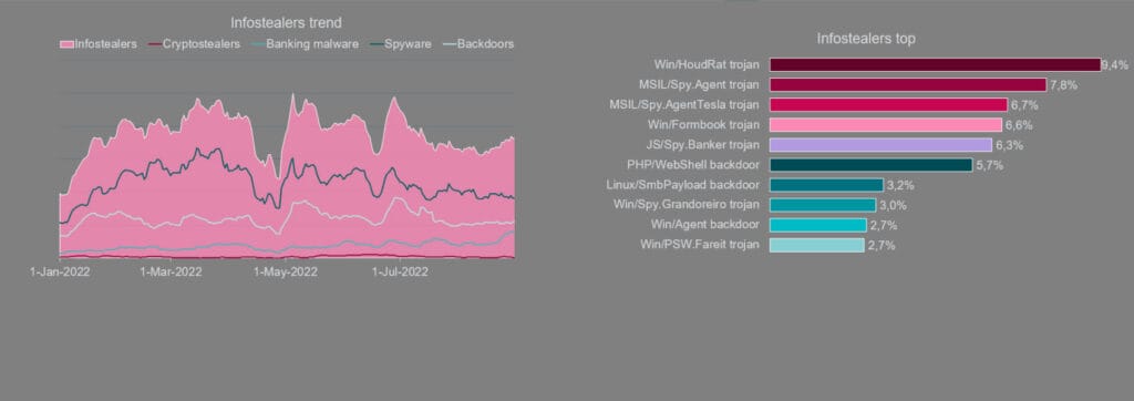 Con respecto al malware del tipo infostealer, una categoría que puede incluir a distintos tipos de malware que tienen la capacidad de robar credenciales e información del equipo de la víctima y enviarla a los atacantes, a nivel global se mantuvo la tendencia a la baja, aunque con algunos picos en julio y agosto. En América Latina el comportamiento de esta categoría de amenaza fue similar, con códigos maliciosos como HoudRAT, AgentTesla y Formbook como ejemplo de alguno de los malware más utilizados para robar información y credenciales de billeteras de criptomonedas.