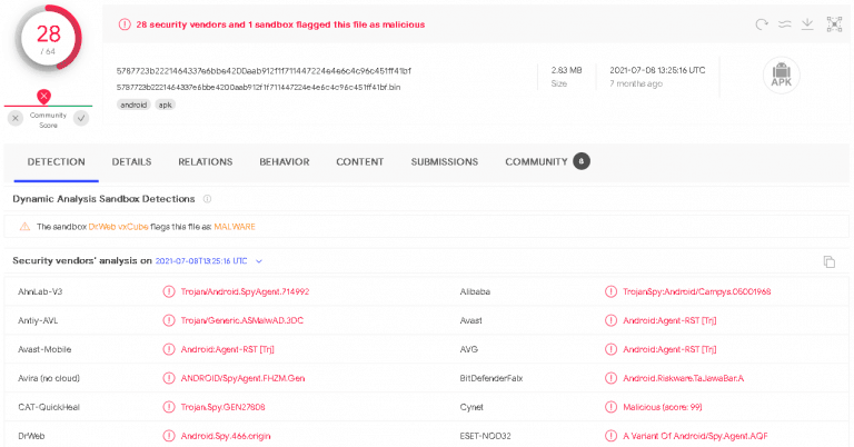 Estos cambios elementales, debido a esta simple ofuscación, resultaron en menos detecciones en VirusTotal. Comparamos las tasas de detección de la muestra descubierta por Check Point desde febrero de 2021 (Figura 8) con la versión ofuscada disponible desde junio de 2021 (Figura 9).