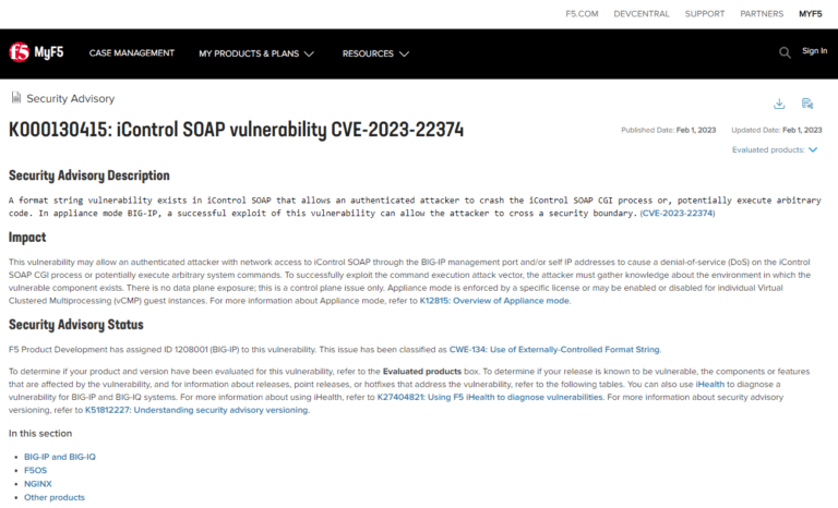 Esta vulnerabilidad recibió el número de identificación 1208001 (BIG-IP) de F5 Product Development. A este problema se le ha asignado el número de identificación CWE-134 y se conoce como Uso de cadenas de formato controladas externamente. Consulte el cuadro etiquetado como «Productos evaluados» para ver si su producto y su versión han sido probados para detectar esta vulnerabilidad. Si se sabe que su versión es vulnerable, también puede determinar qué componentes o funciones se ven afectados por la vulnerabilidad. También puede detectar una vulnerabilidad para los sistemas BIG-IP y BIG-IQ mediante el uso de iHealth.