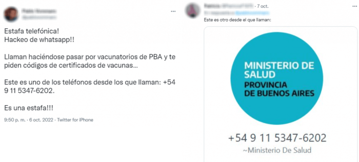 Cuando alertamos a los usuarios en 2021 sobre esta forma de actuar los delincuentes, supimos casos en los que se estaban haciendo pasar por el Gobierno de la Ciudad de Buenos Aires. En los últimos meses hemos visto varias denuncias donde las personas alertan que son contactados por un teléfono con la imagen del Ministerio de Salud de la Provincia de Buenos Aires.