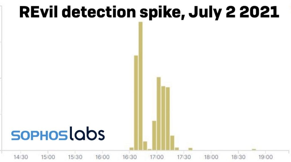 Pico en la telemetría de SophosLabs causado por las detecciones de REvil el 2 de julio de 2021, mostrando cientos de detecciones en su punto máximo.