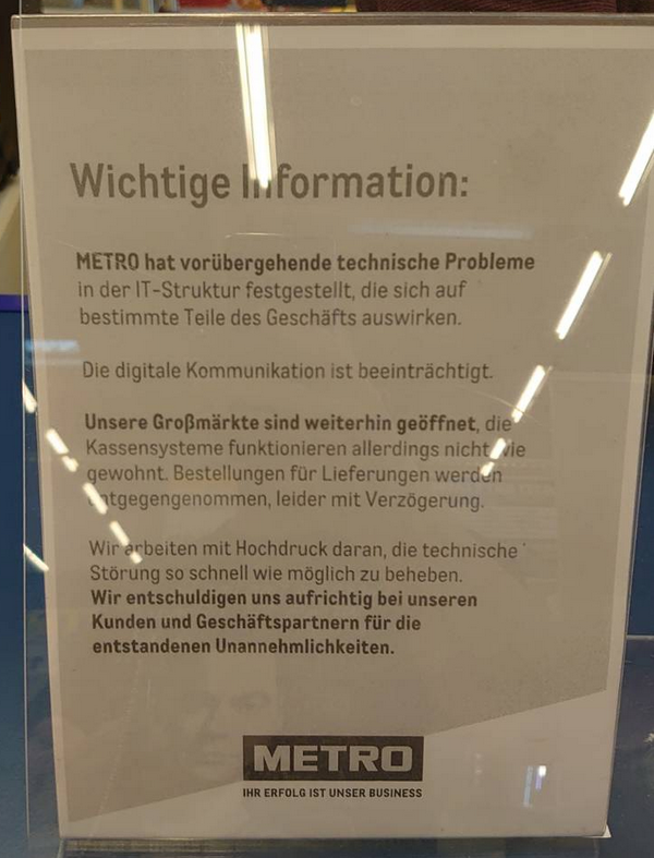 «METRO/MAKRO está experimentando actualmente una interrupción parcial de la infraestructura de TI de varios servicios técnicos», reveló el mayorista en una nota en su sitio web. «El equipo de TI de METRO ha iniciado de inmediato una investigación exhaustiva junto con expertos externos para identificar la causa de la interrupción de los servicios».