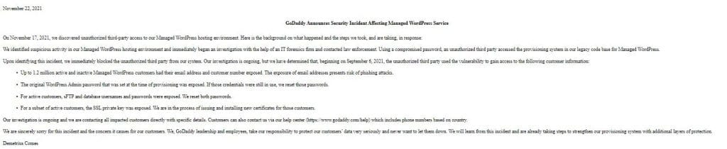 El reporte, firmado por el director de TI Demetrius Comes, señala que GoDaddy identificó la actividad sospechosa en el mencionado entorno de hosting, por lo que de inmediato se puso en contacto con la una firma de ciberseguridad y se alertó a las autoridades correspondientes.