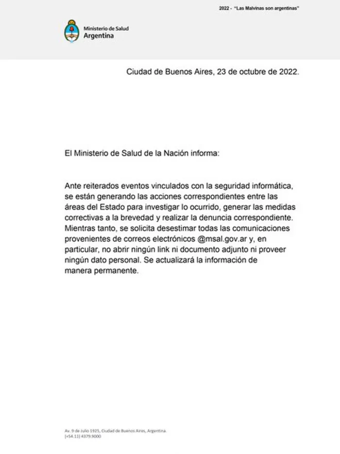 Ante este panorama, desde la cartera de Salud difundieron un comunicado en redes sociales en el que hablaron de “reiterados eventos vinculados con la seguridad informática”. Además, informaron que están “generando las acciones correspondientes entre las áreas del Estado para investigar lo ocurrido, generar las medidas correctivas a la brevedad y realizar la denuncia correspondiente”.
