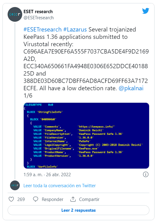 A través de la cuenta oficial de Twitter de ESET Research el investigador Peter Kalnai ha reportado varias muestras de KeePass conteniendo malware del grupo norcoreano Lazarus, del que hemos hablado en otras ocasiones.