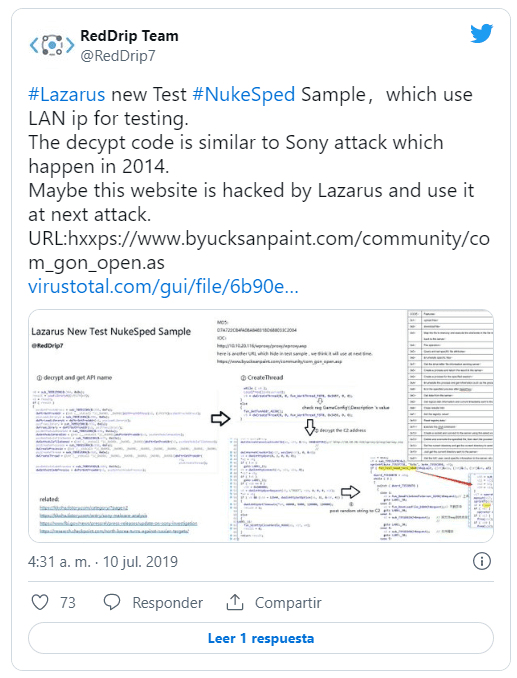 La atribución de estas muestras al grupo Lazarus vienen determinada por la existencia de un fichero DLL conocido que es usado frecuentemente por los backdoors de este APT (T_DLL.dll) desde julio de 2019, detectado en un troyano NukeSped, del mismo grupo.