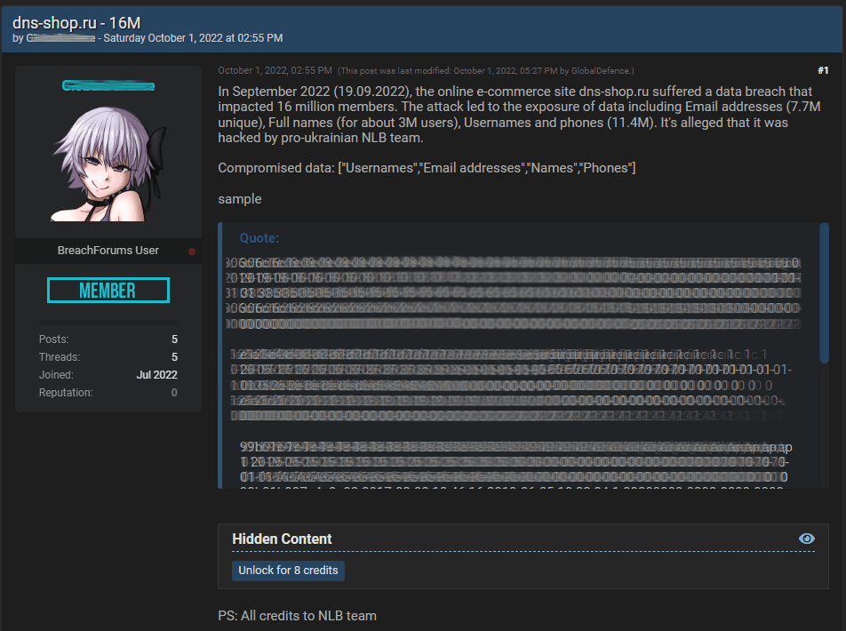 Los datos supuestamente fueron robados el 19 de septiembre y contienen nombres completos, nombres de usuario, direcciones de correo electrónico y números de teléfono de clientes y empleados de DNS de 16 millones de personas.