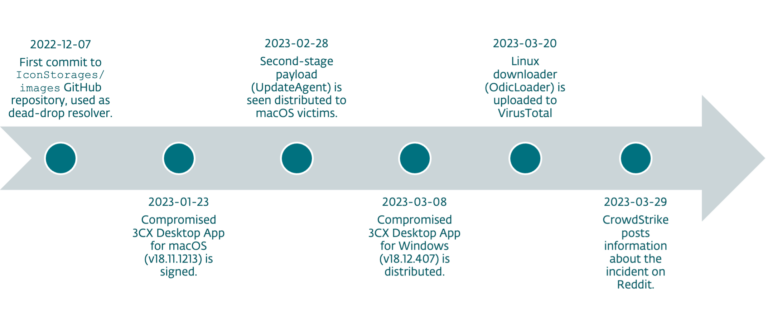 3CX es un desarrollador y distribuidor de software VoIP que ofrece servicios de sistema telefónico a muchas organizaciones a nivel internacional. Según su sitio web, 3CX tiene más de 600,000 clientes y 12,000,000 de usuarios en varios sectores, incluyendo el aeroespacial, la salud y el de la hospitalidad. 3CX proporciona software de cliente para utilizar sus sistemas a través de un navegador web, aplicación móvil o una aplicación de escritorio. A fines de marzo de 2023, se descubrió que la aplicación de escritorio tanto para Windows como para macOS contenía código malicioso que permitía a un grupo de atacantes descargar y ejecutar código arbitrario en todas las máquinas donde se instaló la aplicación. Rápidamente, se determinó que este código malicioso no fue agregado por 3CX, sino que 3CX fue comprometido y que su software fue utilizado en un ataque de cadena de suministro impulsado por actores de amenazas externos para distribuir malware adicional a clientes específicos de 3CX.
