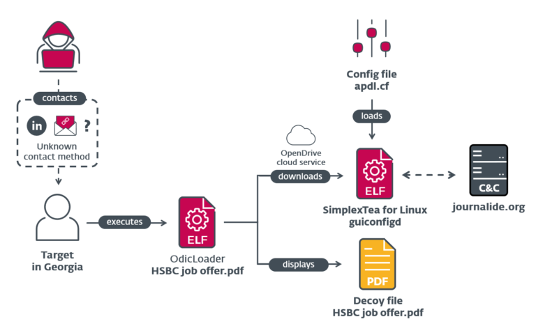 Investigadores de ESET descubrieron una nueva campaña del grupo de APT Lazarus llamada Operación DreamJob dirigida a usuarios de Linux. Operación DreamJob es el nombre de una serie de campañas en las que el grupo utiliza técnicas de ingeniería social para comprometer a sus objetivos mediante falsas ofertas de trabajo que utiliza como anzuelo. En este caso, hemos sido capaces de reconstruir toda la cadena, desde el archivo ZIP que entrega una oferta de trabajo falsa de HSBC como señuelo, hasta el payload final: el backdoor de Linux SimplexTea distribuido a través de una cuenta de almacenamiento en la nube de OpenDrive. Hasta donde sabemos, esta es la primera referencia pública a este importante actor de amenazas alineado con Corea del Norte utilizando malware para Linux como parte de esta operación.