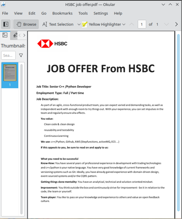 La Operación DreamJob del grupo Lazarus involucra el acercamiento a sus objetivos a través de LinkedIn y tentarlos con ofertas de trabajo dirigidas a líderes de ciertas industrias. El nombre fue acuñado por ClearSky en un artículo publicado en agosto de 2020. Ese artículo describe una campaña de ciberespionaje de Lazarus dirigida a empresas de defensa y aeroespaciales. La actividad se superpone con lo que ESET denominó Operación In(ter)ception, que fue el análisis de una serie de ataques con fines de ciberespionaje que han estado en curso desde al menos septiembre de 2019 y que apuntan a empresas aeroespaciales, militares y de defensa y en los cuales se utilizan herramientas maliciosas específicas, inicialmente solo para Windows. Durante julio y agosto de 2022, encontramos dos instancias de Operación In(ter)ception que apuntaban a macOS. Se subió una muestra de malware a VirusTotal desde Brasil, y otro ataque apuntó a un usuario de las soluciones de ESET en Argentina. Hace unas semanas, se encontró en VirusTotal un payload nativo para Linux junto con un documento utilizado como señuelo en formato PDF y que utiliza el nombre de HSBC. Esto completa la capacidad de Lazarus de poder comprometer todos los principales sistemas operativos de escritorio.