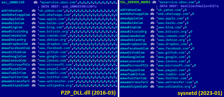 - P2P_DLL.dll (SHA-1: 65122E5129FC74D6B5EBAFCC3376ABAE0145BC14), muestra similitudes de código con sysnetd en la forma de los dominios utilizados como fachada para una conexión TLS falsa (ver Figura 4). CISA lo atribuyó a Lazarus en diciembre de 2017. A partir de septiembre de 2019, CISA comenzó a llamar a las versiones más nuevas de este malware BADCALL (SHA-1: D288766FA268BC2534F85FD06A5D52264E646C47).