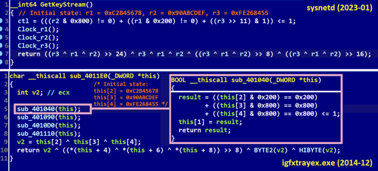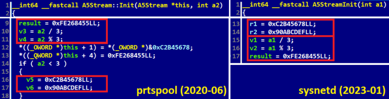 prtspool (SHA-1: 58B0516D28BD7218B1908FB266B8FE7582E22A5F) muestra similitudes de código con sysnetd (ver Figura 5). Fue atribuido a Lazarus por CISA en febrero de 2021. También se observa que SIMPLESEA, un backdoor para macOS descubierto durante la respuesta al incidente de 3CX, implementa el cifrado de flujo A5/1.
