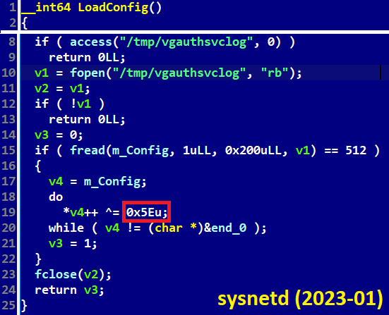 Esta versión para Linux del backdoor BADCALL, sysnetd, carga su configuración desde un archivo llamado /tmp/vgauthsvclog. Dado que los operadores de Lazarus han disfrazado previamente sus payloads, el uso de este nombre, que es utilizado por el servicio de autenticación de invitados de VMware, sugiere que el sistema objetivo puede ser una máquina virtual VMware de Linux. Es interesante destacar que la clave XOR en este caso es la misma que la utilizada en SIMPLESEA de la investigación de 3CX.