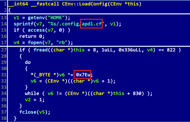 - El payload de SimplexTea carga su configuración de una manera muy similar al malware SIMPLESEA según la respuesta oficial sobre el incidente a 3CX. La clave XOR difiere (0x5E vs. 0x7E), pero la configuración tiene el mismo nombre: apdl.cf (ver Figura 8).