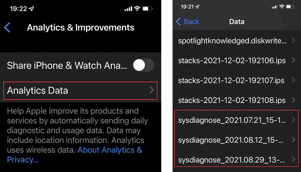 Detona sysdiags con frecuencia y guárdalos en copias de seguridad externas. Los artefactos forenses pueden ayudarte a determinar después si has sido objetivo de ataque. Detonar un sysdiag depende del modelo del teléfono; por ejemplo, en algunos iPhone, se hace al presionar los botones Subir volumen + Bajar volumen + Encendido al mismo tiempo. Es posible que necesites intentar un par de veces hasta que el sientas el zumbido del teléfono. Una vez que se crear el sysdiag, aparecerá en el diagnóstico: