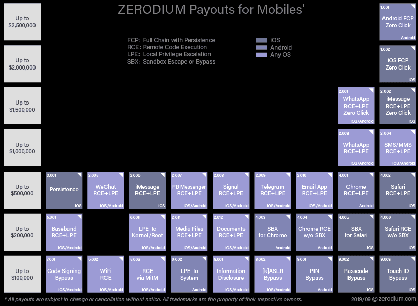 Lo primero que tenemos que destacar es que Pegasus es un kit de herramientas que se vende a los estados nación a precios relativamente elevados. El costo de una implementación completa podría llegar hasta los millones de dólares. De igual manera, otro malware móvil de tipo APT podría desplegarse mediante exploits de día cero, cero clic. Estos son bastante caros; por ejemplo, Zerodium, una firma de brokers de exploits paga hasta 2.5 millones de dólares por una cadena de infección de cero clic en Android que sea persistente: