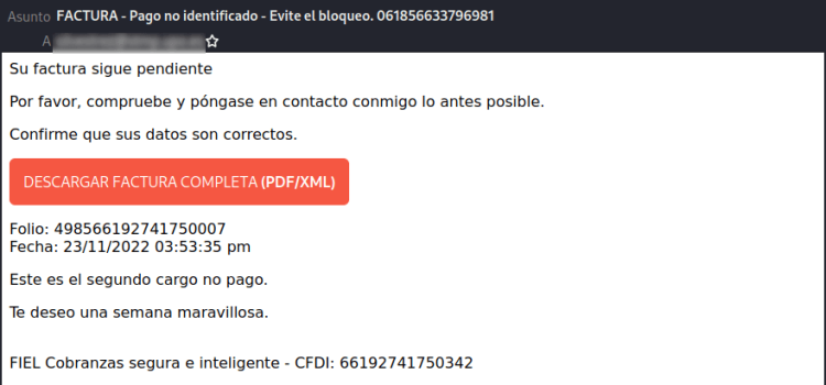 Los ciberatacantes engañaron a sus víctimas mediante un correo que les notificó de la supuesta entrega de un comprobante fiscal digital (CFDI), o factura, en un archivo con formato ZIP que simula contener un archivo PDF y otro XML.
