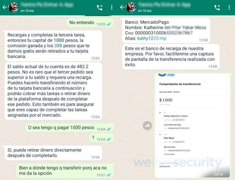 Como mencionamos anteriormente, la víctima fue capaz en tres oportunidades de retirar los fondos, pero esto es solo para que la víctima crea que se trata de un trabajo real y continúe depositando. Sin embargo, en un momento dado el monto de los depósitos aumentó considerablemente y pasó de ser 4.000 a 35.000 pesos. Ya en esta etapa si la víctima no accedía a depositar el dinero no podía retirar las ganancias acumuladas, y es ahí que cae en la cuenta de que era un fraude.