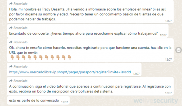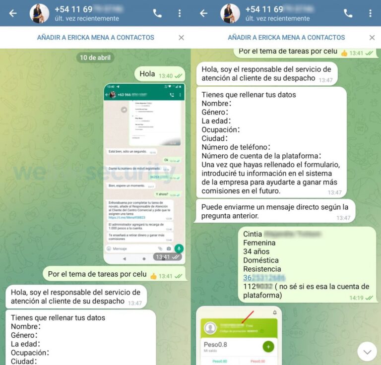 En este caso, una vez que la víctima acepta y decide continuar es derivada a otra cuenta de WhatsApp asociada a un número de teléfono con el código +63, perteneciente a Filipinas. Desde esta segunda cuenta una supuesta asesora explica es el procedimiento. La persona debe registrarse en una plataforma a la cual deben acceder a través de un enlace que envían junto con un código de registro. Una vez que persona se registra ingresando su número de teléfono y “otros datos personales” se encontrará un repositorio de productos que debe comprar y luego enviar para comenzar a ganar dinero en forma de comisiones.