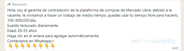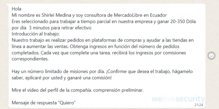 Al menos desde mediados de 2022 hemos recibido varios reportes de personas de este modelo de fraude. Si bien muchas personas lograron detectarla a tiempo, otras cayeron en la trampa y perdieron su dinero. A continuación compartimos algunos ejemplos de los mensajes con los que pueden intentar atraer a las personas a esta falsa oportunidad de ganar dinero.