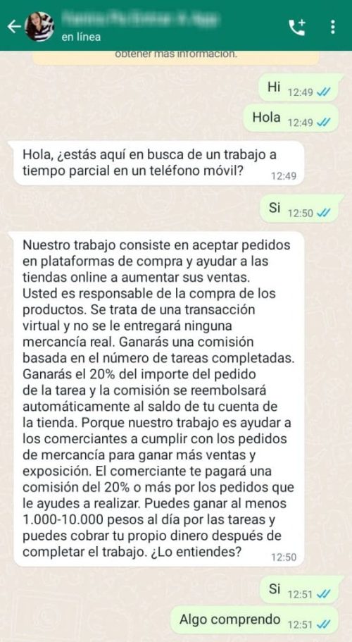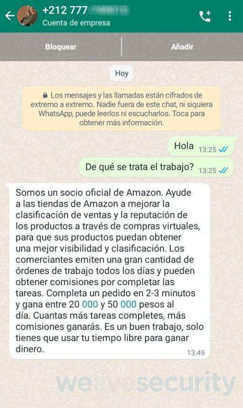 Al hacer clic en “más información” la víctima abrió un chat de WhatsApp asociado a un número de Marruecos (+212). Tras consultar de qué se trata el empleo, los estafadores respondieron que son socios de Amazon y que la invitación es para participar en un programa de afiliados que tiene como objetivo mejorar la clasificación de las ventas y la reputación de los productos que se ofrecen en tiendas virtuales. El trabajo ofrecido consiste en completar tareas. Estas tareas se presentan como “aceptar pedidos” de productos en distintas plataformas de compras para supuestamente “ayudar a las tiendas online a aumentar las ventas”.
