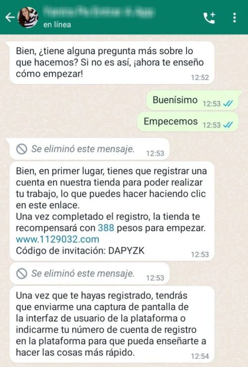 Para empezar la persona debe registrarse en una plataforma. Los supuestos representantes envían un enlace (el cual varía y hemos observado varios ejemplos) junto con un código de acceso. Una vez que las personas se registran en la plataforma se encontrarán con un saldo positivo que les permite comenzar a trabajar o “enviar pedidos” inmediatamente y de esta manera empezar a ganar comisiones.
