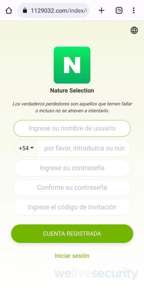 En este caso, una vez que la víctima acepta y decide continuar es derivada a otra cuenta de WhatsApp asociada a un número de teléfono con el código +63, perteneciente a Filipinas. Desde esta segunda cuenta una supuesta asesora explica es el procedimiento. La persona debe registrarse en una plataforma a la cual deben acceder a través de un enlace que envían junto con un código de registro. Una vez que persona se registra ingresando su número de teléfono y “otros datos personales” se encontrará un repositorio de productos que debe comprar y luego enviar para comenzar a ganar dinero en forma de comisiones.