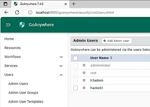 «El indicador más fácil de compromiso que se puede analizar es cualquier nueva incorporación al grupo ‘Usuarios administradores’ en la sección Usuarios -> Usuarios administradores del portal de administrador de GoAnywhere», afirmó Zach Hanley, ingeniero jefe de ataques de Horizon3.