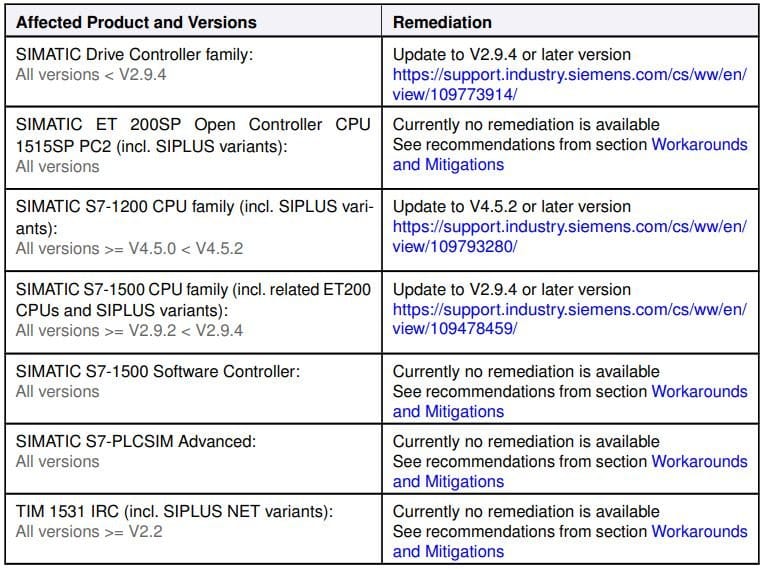 Siemens reporta que las fallas residen en los productos PLC SIMATIC S7-1200 y S7-1500, SIMATIC Drive Controller, ET 200SP Open Controller, S7-1500 Software Controller, SIMATIC S7-PLCSIM Advanced, el módulo de comunicación TIM 1531 IRC y en los productos SIPLUS extreme.