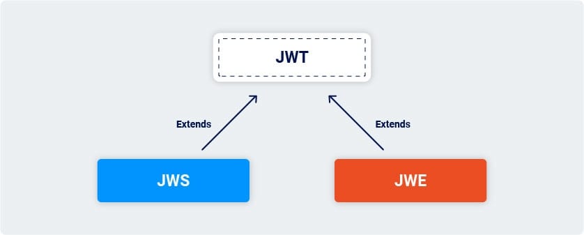 La especificación JWT es en realidad muy limitada. Solo define un formato para representar información («reclamaciones») como un objeto JSON que se puede transferir entre dos partes. En la práctica, los JWT no se usan realmente como una entidad independiente. La especificación JWT se amplía con las especificaciones JSON Web Signature (JWS) y JSON Web Encryption (JWE), que definen formas concretas de implementar JWT.
