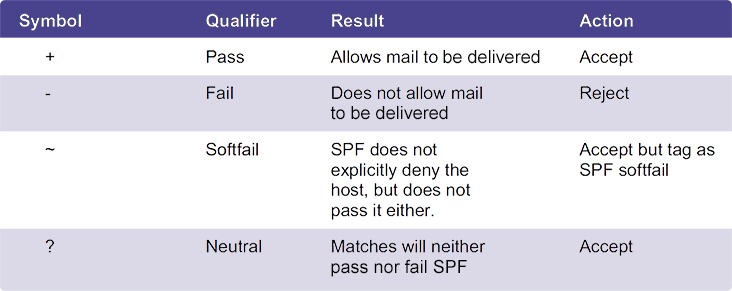 Se pueden configurar mecanismos para describir quién puede enviar correo en nombre de un dominio. Si se cumplen esas condiciones, se puede aplicar uno de los cuatro calificadores.