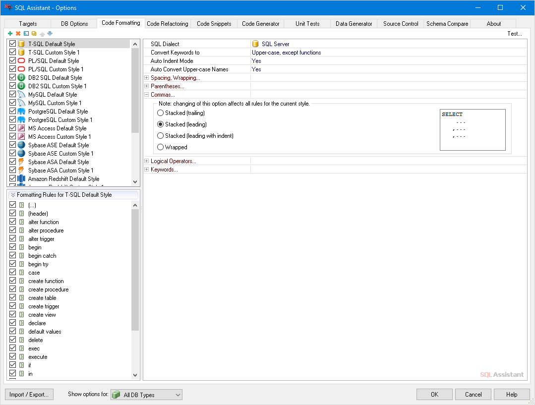 SQL Assistant se integra fácilmente con muchos editores de bases de datos usados actualmente así tambien con administradores y ambientes de desarrollo incluidas herramientas nativas que vienen con los sistemas de bases de datos. Esta proporciona asistencia en el tecleo del código, completando automaticamente palabras y objetos de la base de datos y atributos del navegador. Esta proporciona funciones para la rápida entrada de construcciones comunes de SQL y recortes de código. Tambien proporciona integrado y completamente interactivo un sistema de asistencia de código SQL para ayudar al instante con comandos de sintaxis SQL y opciones disponibles en versiones de bases de datos especificas.