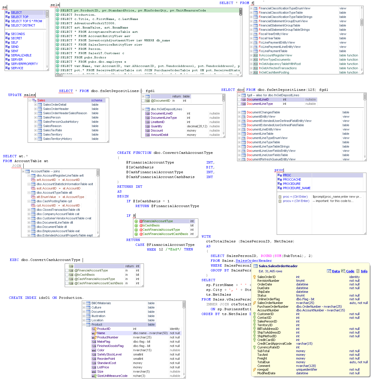 - Proporciona funciones avanzadas de intellisense de código SQL, que incluyen soporte para bases de datos, objetos, parámetros, variables de script, elementos de sintaxis y más …
